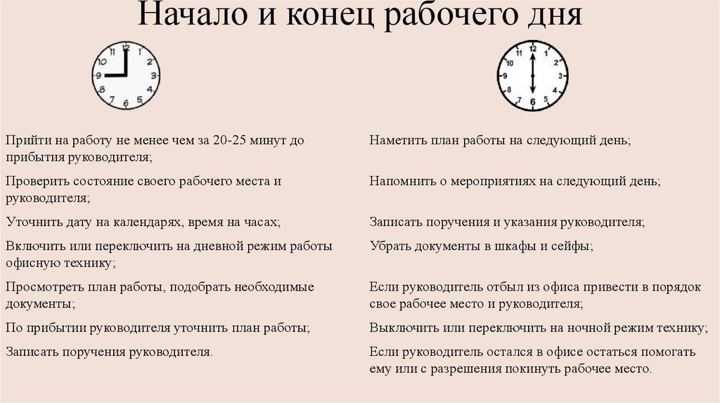 Начало и конец рабочего дняПрийти на работу не менее чем за 20-25 минут до