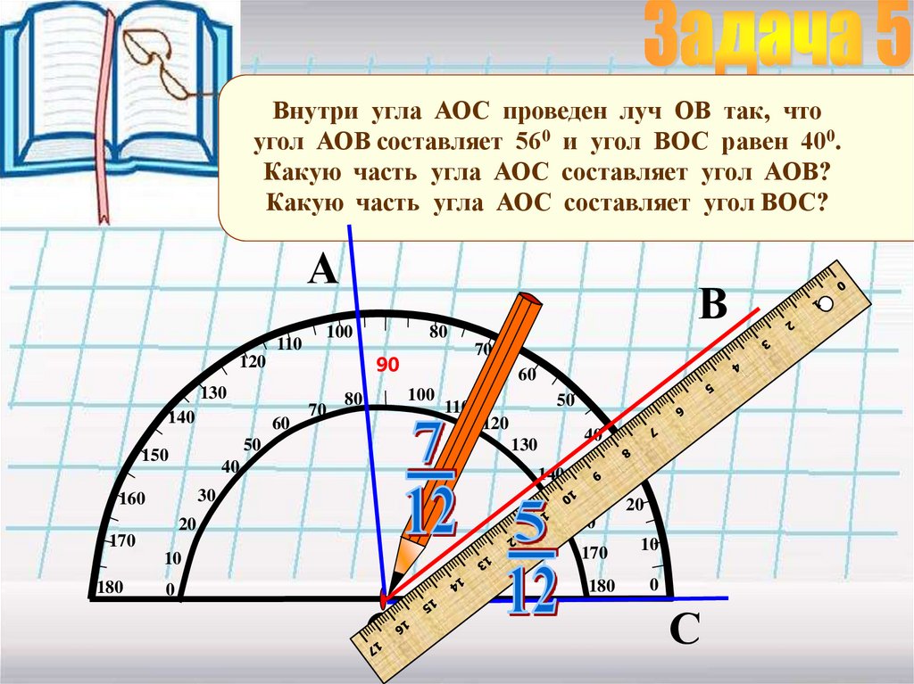 Внутри угла АОС проведен луч ОВ так, чтоугол АОВ составляет 560 и угол ВОС равен 400.