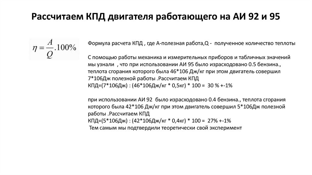 Рассчитаем КПД двигателя работающего на АИ 92 и 95Формула расчета КПД , где A-полезная работа,Q - полученное количество теплоты