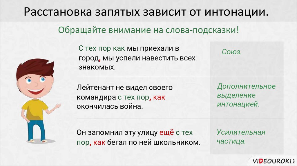 Расстановка запятых зависит от интонации.Обращайте внимание на слова-подсказки!