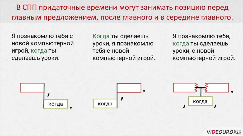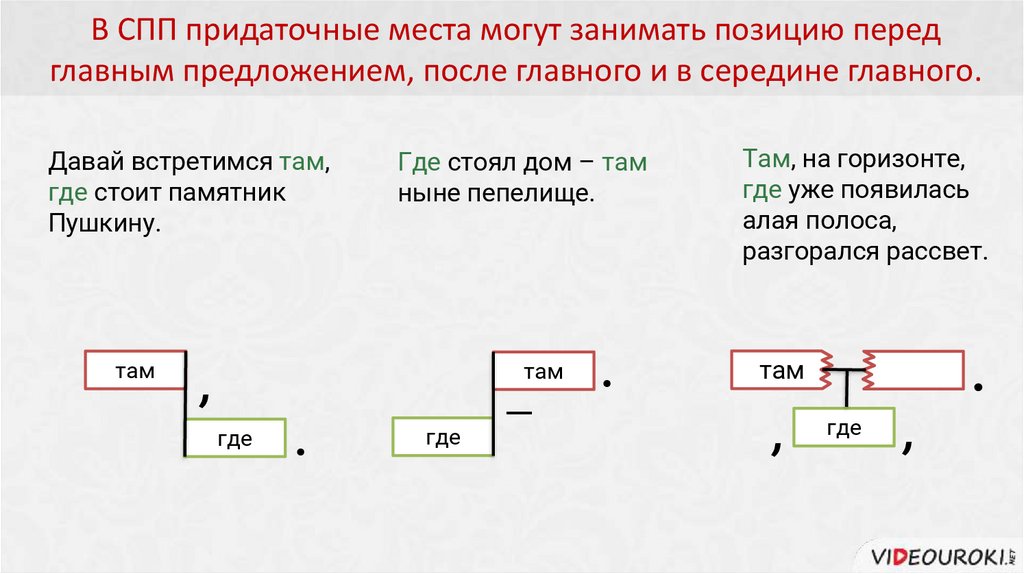 В CПП придаточные места могут занимать позицию передглавным предложением, после главного и в середине главного.
