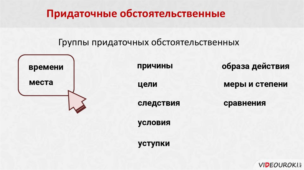 Придаточные обстоятельственныеГруппы придаточных обстоятельственных
