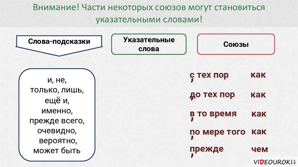 Внимание! Части некоторых союзов могут становитьсяуказательными словами!