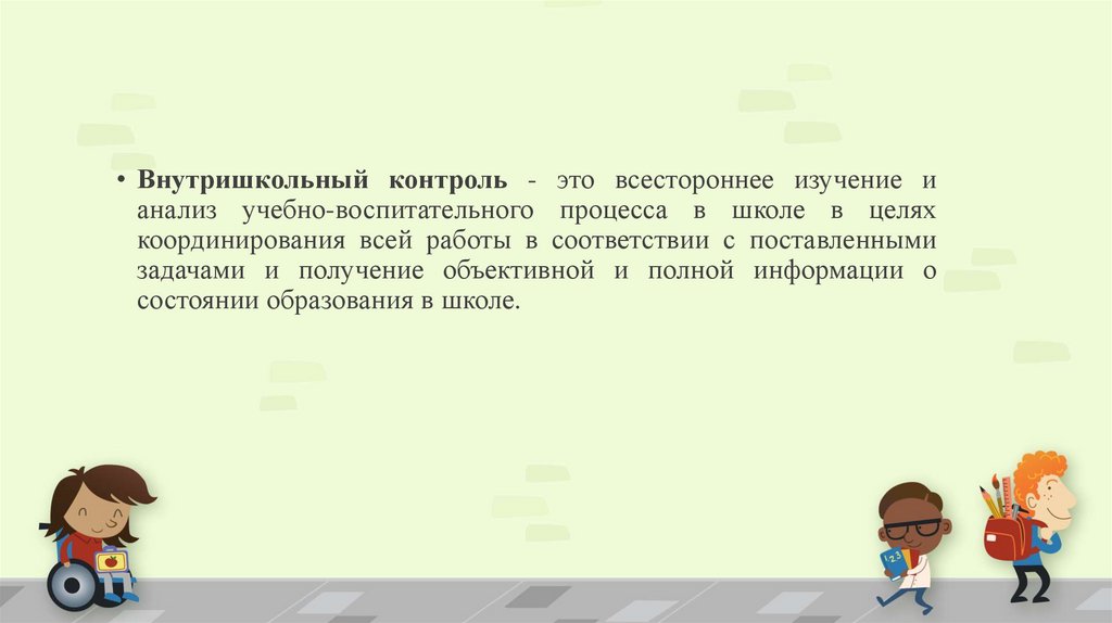 • Внутришкольный контроль - это всестороннее изучение ианализ учебно-воспитательного процесса в школе в целях