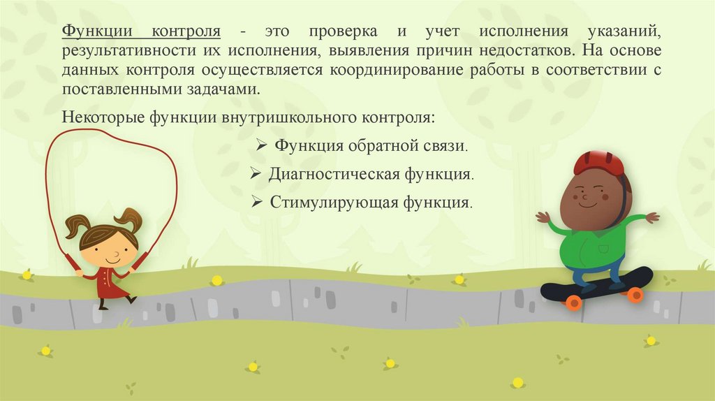 Функции контроля - это проверка и учет исполнения указаний,результативности их исполнения, выявления причин недостатков. На основе