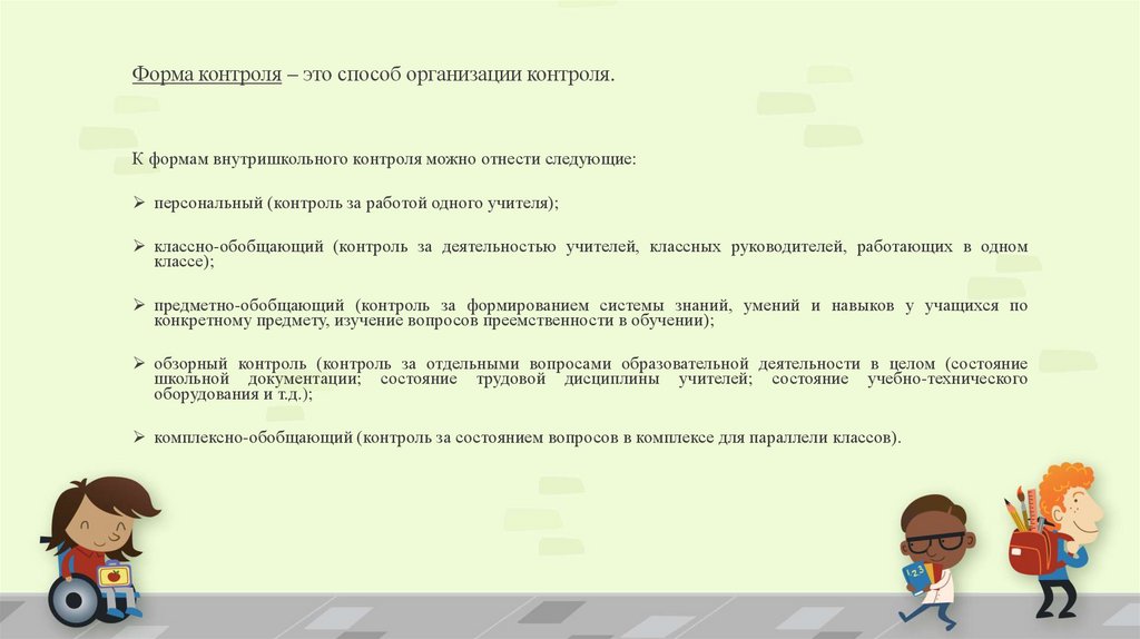 Форма контроля – это способ организации контроля.К формам внутришкольного контроля можно отнести следующие: