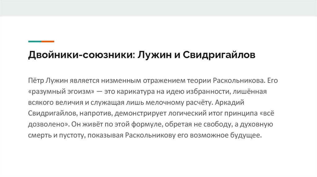 Двойники-союзники: Лужин и СвидригайловПётр Лужин является низменным отражением теории Раскольникова. Его