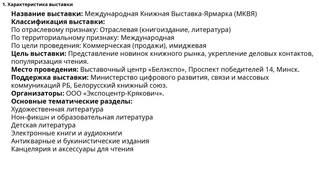 1. Характеристика выставкиНазвание выставки: Международная Книжная Выставка-Ярмарка (МКВЯ)