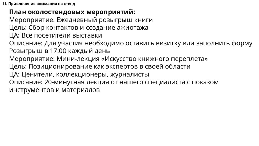 11. Привлечение внимания на стендПлан околостендовых мероприятий: