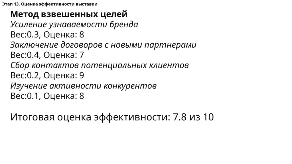 Этап 13. Оценка эффективности выставкиМетод взвешенных целей