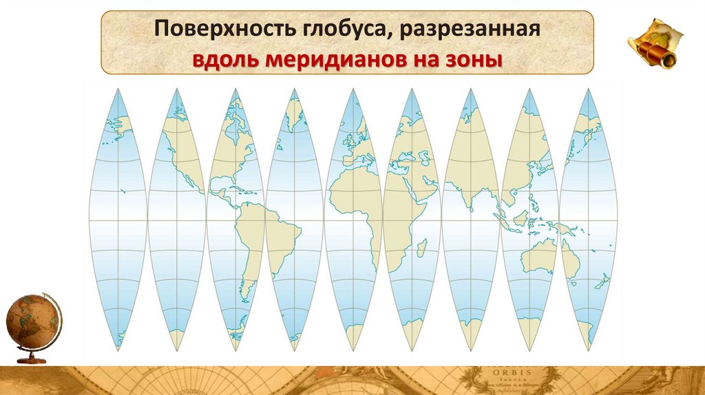 Поверхность глобуса, разрезаннаявдоль меридианов на зоны
