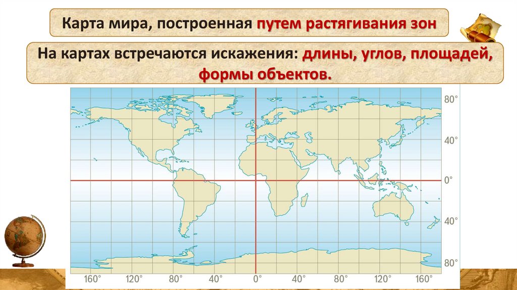 Карта мира, построенная путем растягивания зонНа картах встречаются искажения: длины, углов, площадей,