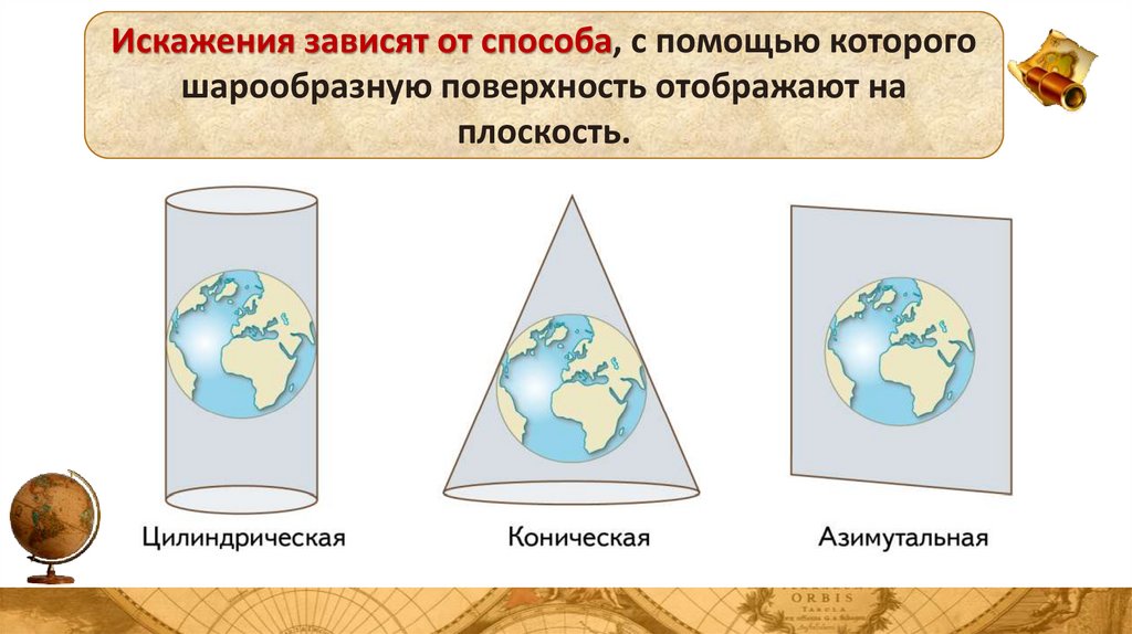 Искажения зависят от способа, с помощью которогошарообразную поверхность отображают на