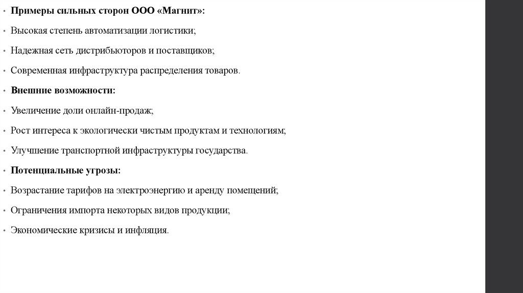 • Примеры сильных сторон ООО «Магнит»:• Высокая степень автоматизации логистики;