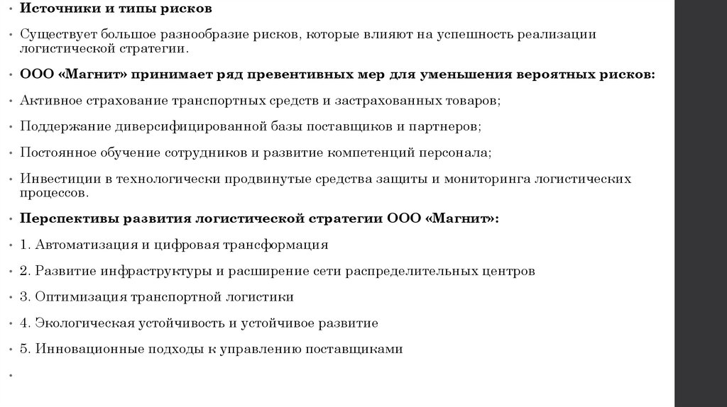 • ООО «Магнит» принимает ряд превентивных мер для уменьшения вероятных рисков: