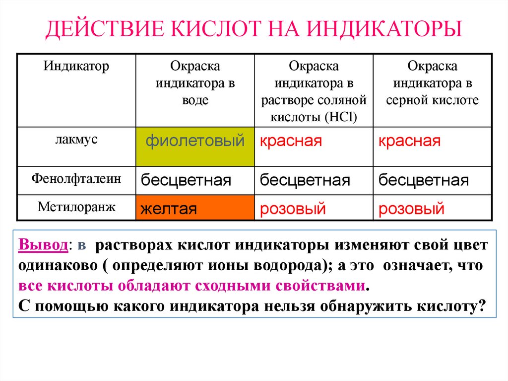 Вывод: в растворах кислот индикаторы изменяют свой цвет
