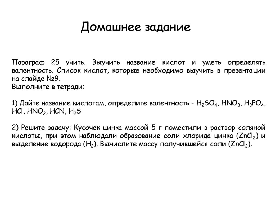 Домашнее заданиеПараграф 25 учить. Выучить название кислот и уметь определять