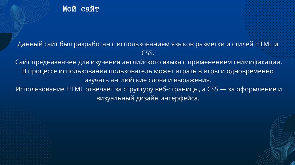 Изучение языков с геймфикациейМой сайт предназначен для изучения английского языка с помощью геймификации.