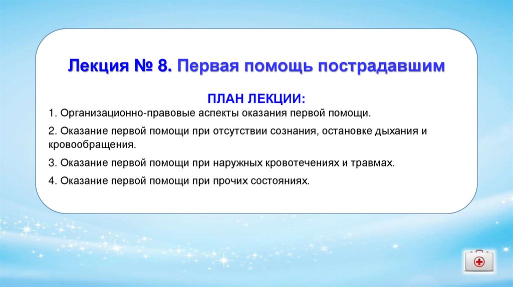Лекция № 8. Первая помощь пострадавшимПЛАН ЛЕКЦИИ: