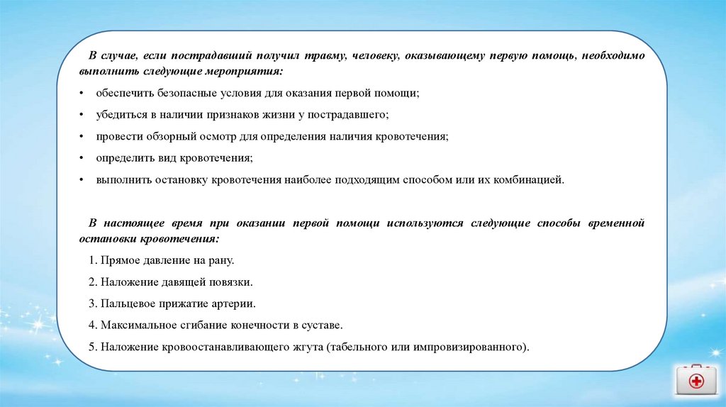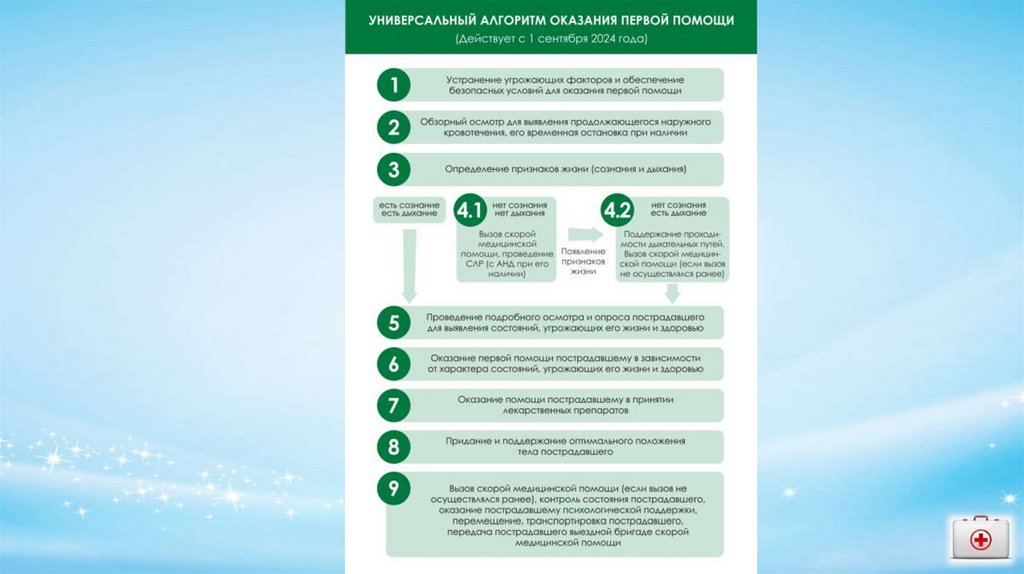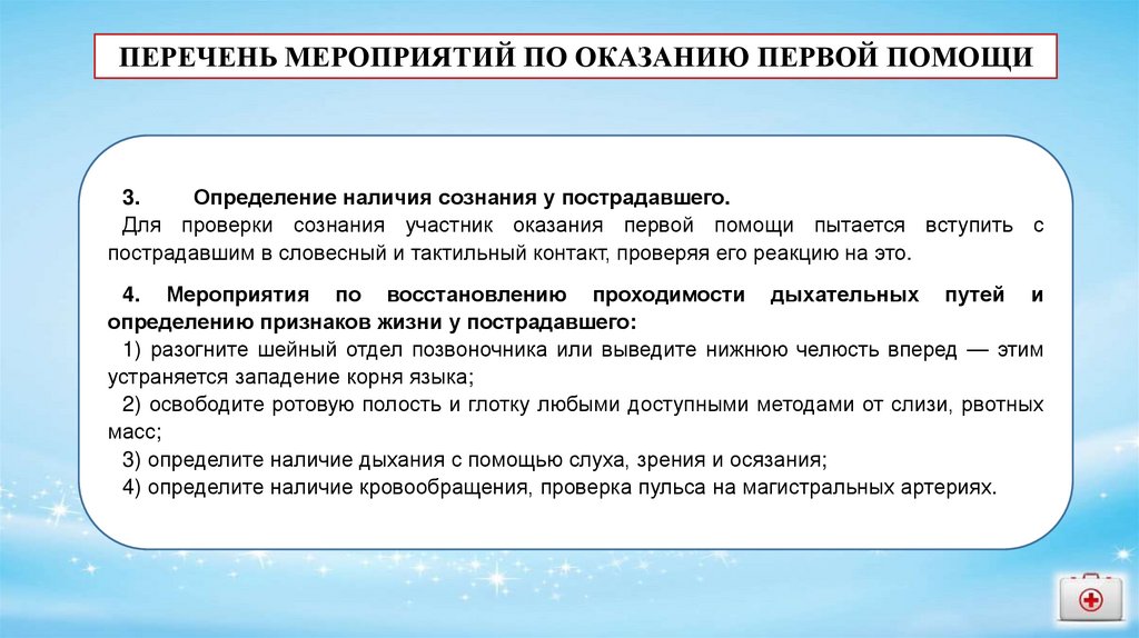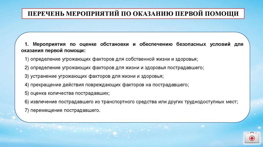 ПЕРЕЧЕНЬ МЕРОПРИЯТИЙ ПО ОКАЗАНИЮ ПЕРВОЙ ПОМОЩИ1. Мероприятия по оценке обстановки и обеспечению безопасных условий для
