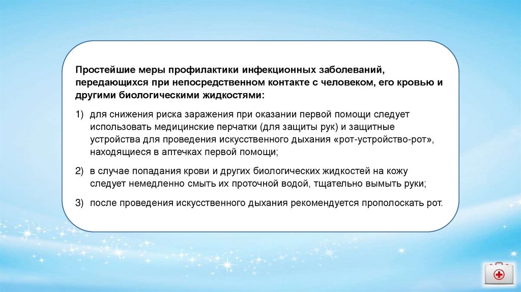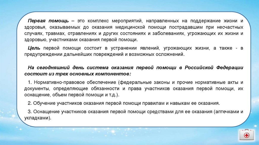 Первая помощь – это комплекс мероприятий, направленных на поддержание жизни издоровья, оказываемых до оказания медицинской помощи пострадавшим при несчастных