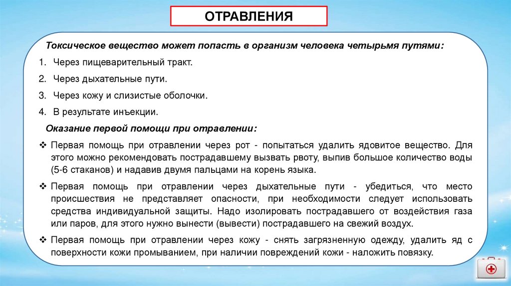 ОТРАВЛЕНИЯТоксическое вещество может попасть в организм человека четырьмя путями: