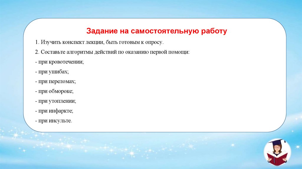 2. Составьте алгоритмы действий по оказанию первой помощи: