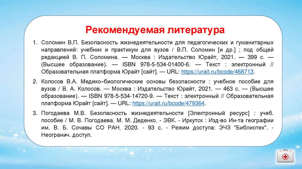 Рекомендуемая литература1. Соломин В.П. Безопасность жизнедеятельности для педагогических и гуманитарных