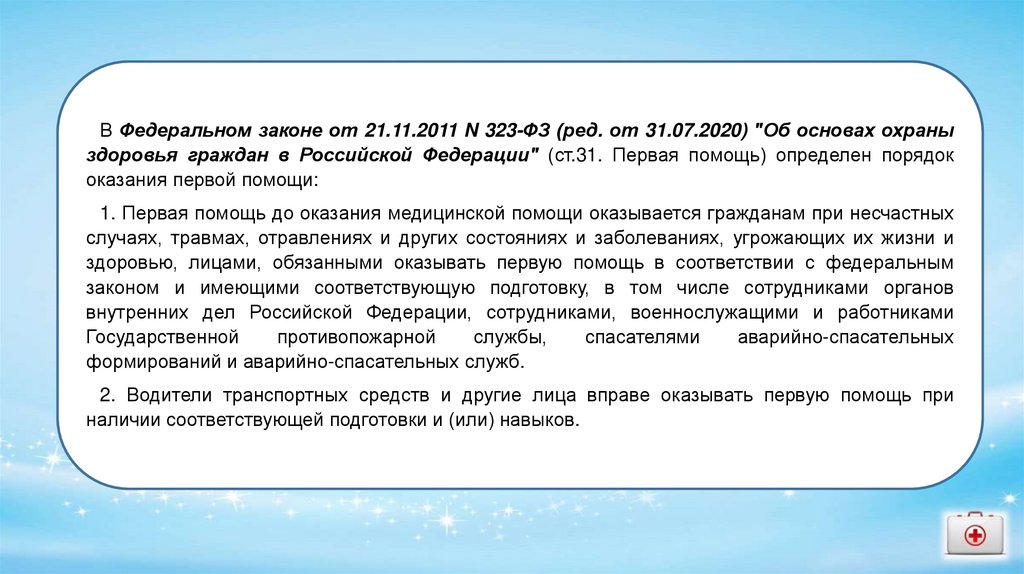 В Федеральном законе от 21.11.2011 N 323-ФЗ (ред. от 31.07.2020) "Об основах охраныздоровья граждан в Российской Федерации" (ст.31. Первая помощь) определен порядок