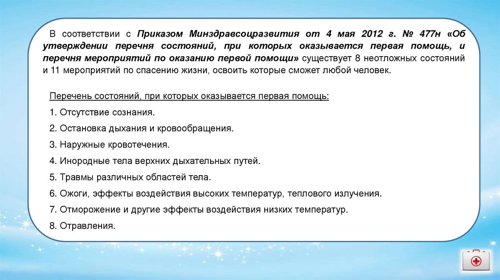 В соответствии с Приказом Минздравсоцразвития от 4 мая 2012 г. № 477н «Обутверждении перечня состояний, при которых оказывается первая помощь, и