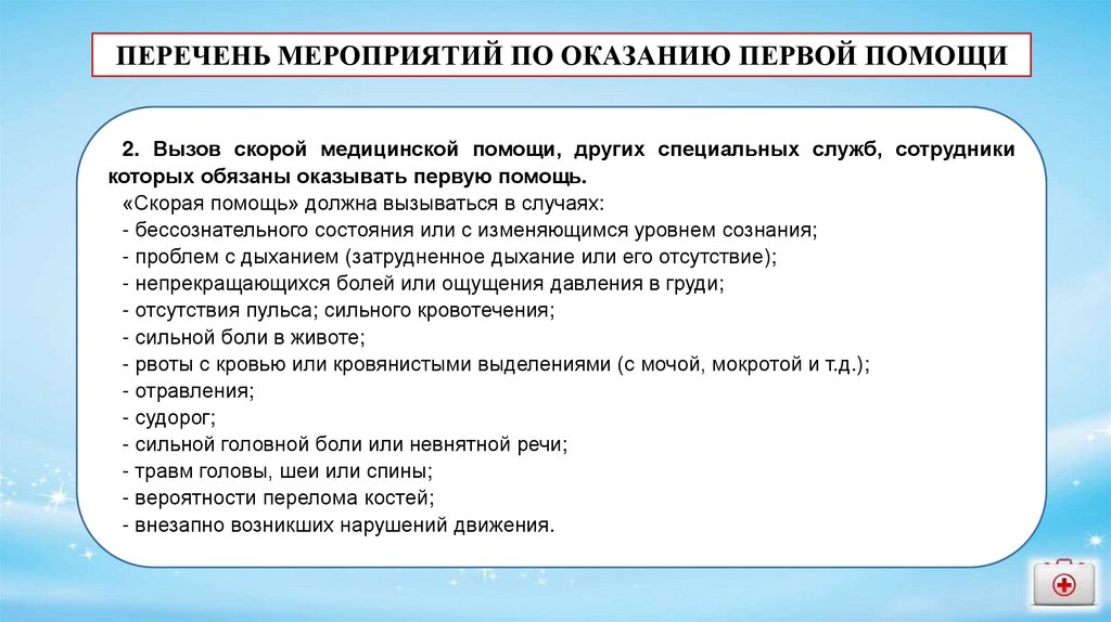 ПЕРЕЧЕНЬ МЕРОПРИЯТИЙ ПО ОКАЗАНИЮ ПЕРВОЙ ПОМОЩИ2. Вызов скорой медицинской помощи, других специальных служб, сотрудники