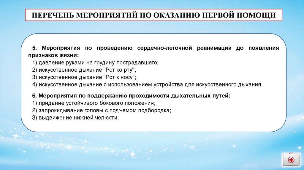 ПЕРЕЧЕНЬ МЕРОПРИЯТИЙ ПО ОКАЗАНИЮ ПЕРВОЙ ПОМОЩИ5. Мероприятия по проведению сердечно-легочной реанимации до появления