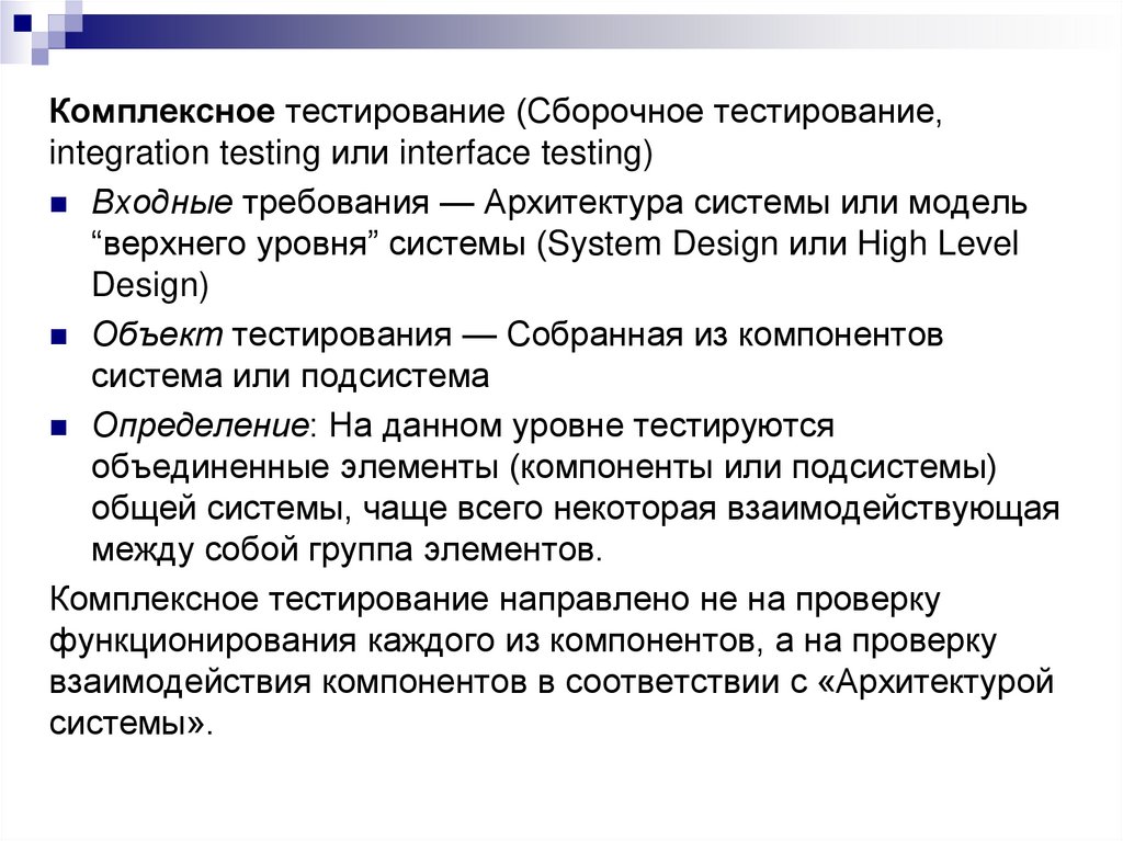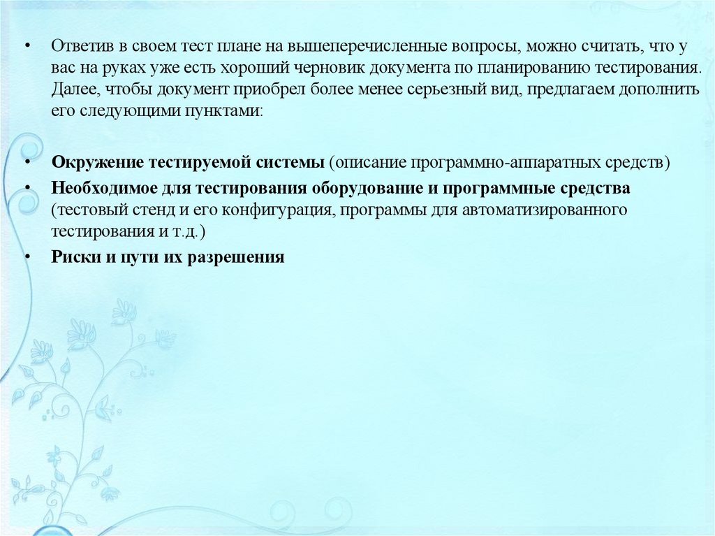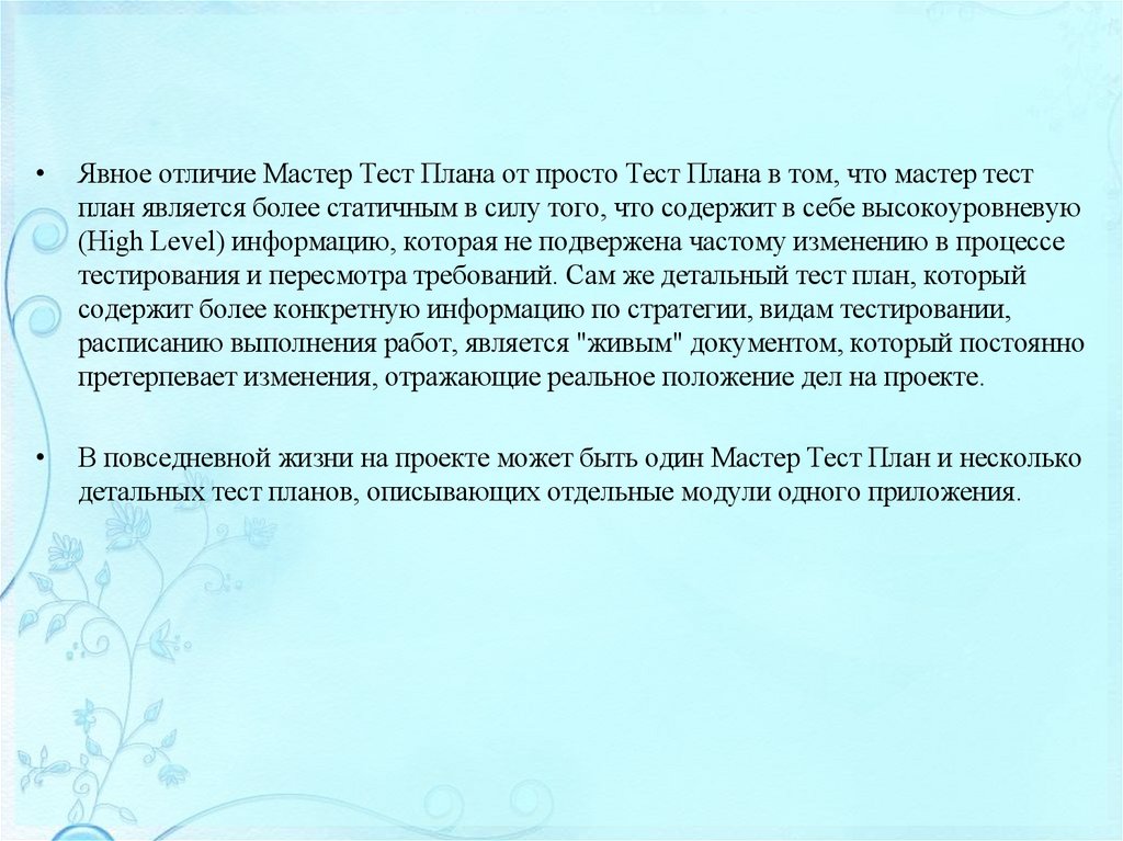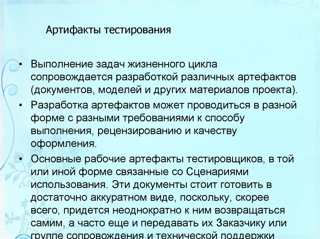 изучения, спецификаций требований, планов тестирования и