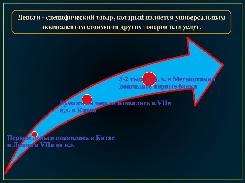 Деньги - специфический товар, который является универсальнымэквивалентом стоимости других товаров или услуг.