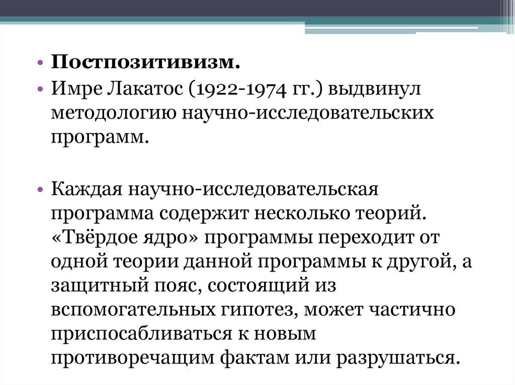 • Постпозитивизм.• Имре Лакатос (1922-1974 гг.) выдвинул