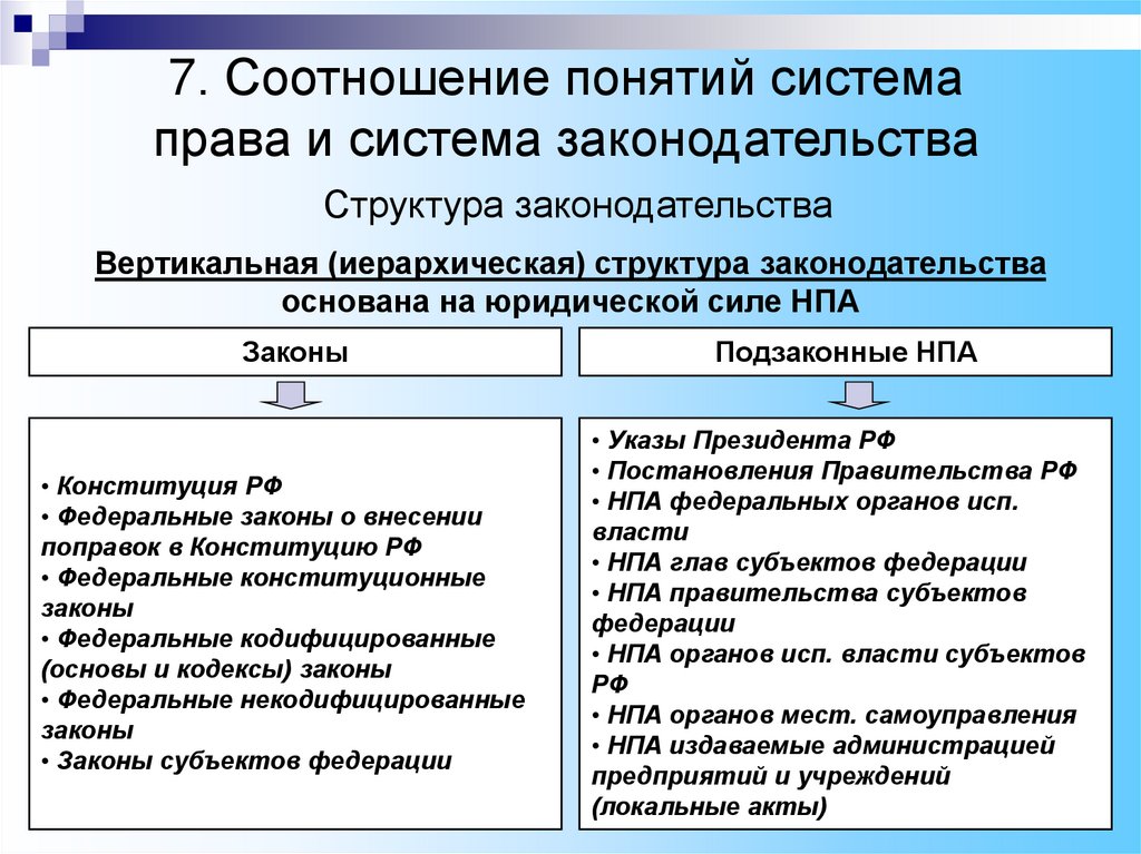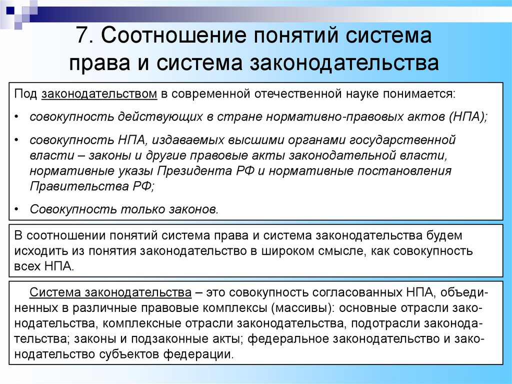 Система права и система законодательства понятия тесно взаимосвязанные, однопорядковые, но не тождественные.