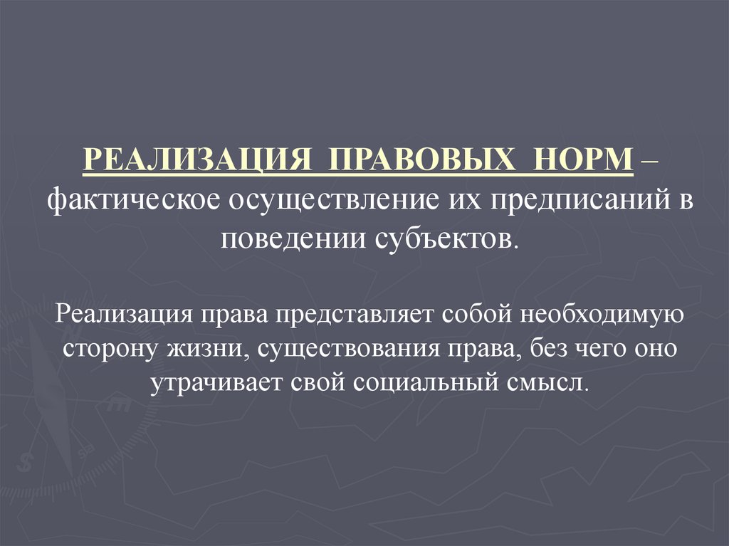 РЕАЛИЗАЦИЯ ПРАВОВЫХ НОРМ –фактическое осуществление их предписаний в