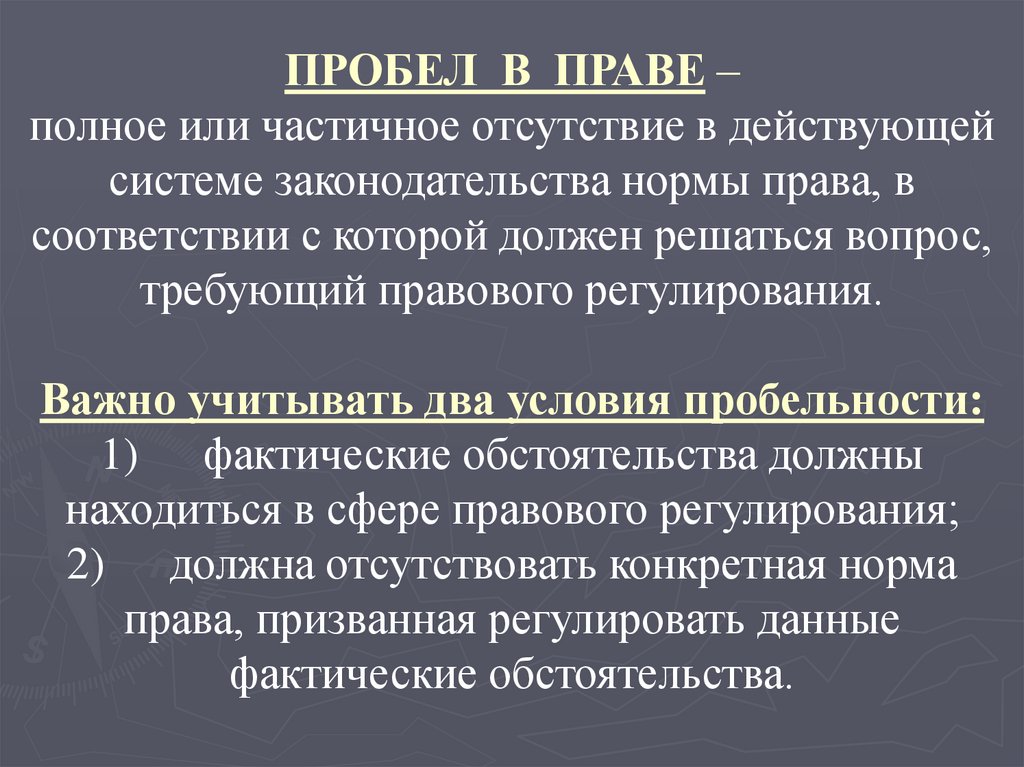 ПРОБЕЛ В ПРАВЕ –полное или частичное отсутствие в действующей