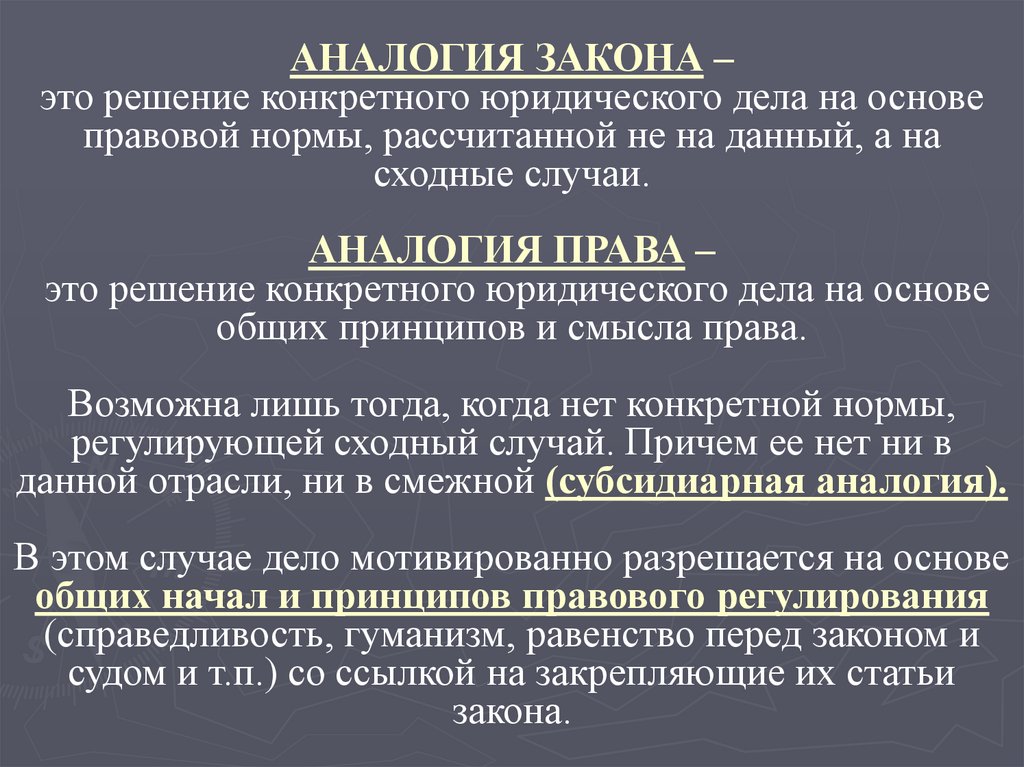 АНАЛОГИЯ ЗАКОНА –это решение конкретного юридического дела на основе