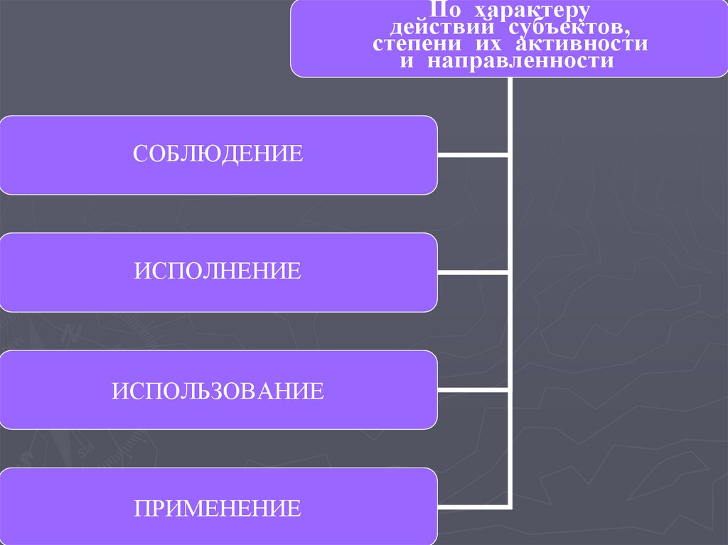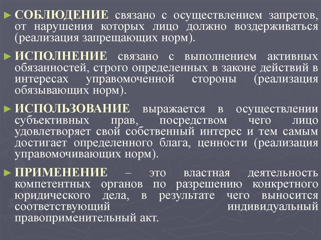 ► СОБЛЮДЕНИЕ связано с осуществлением запретов,от нарушения которых лицо должно воздерживаться
