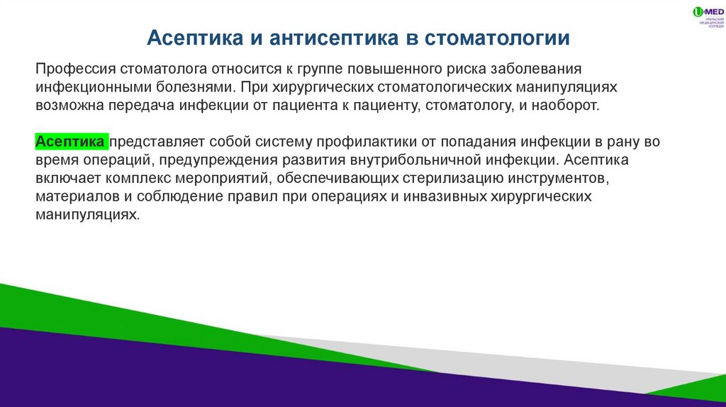 Асептика и антисептика в стоматологииПрофессия стоматолога относится к группе повышенного риска заболевания