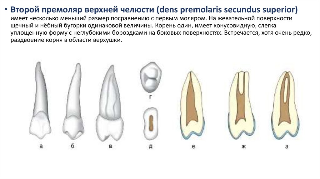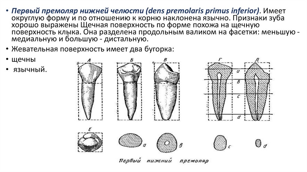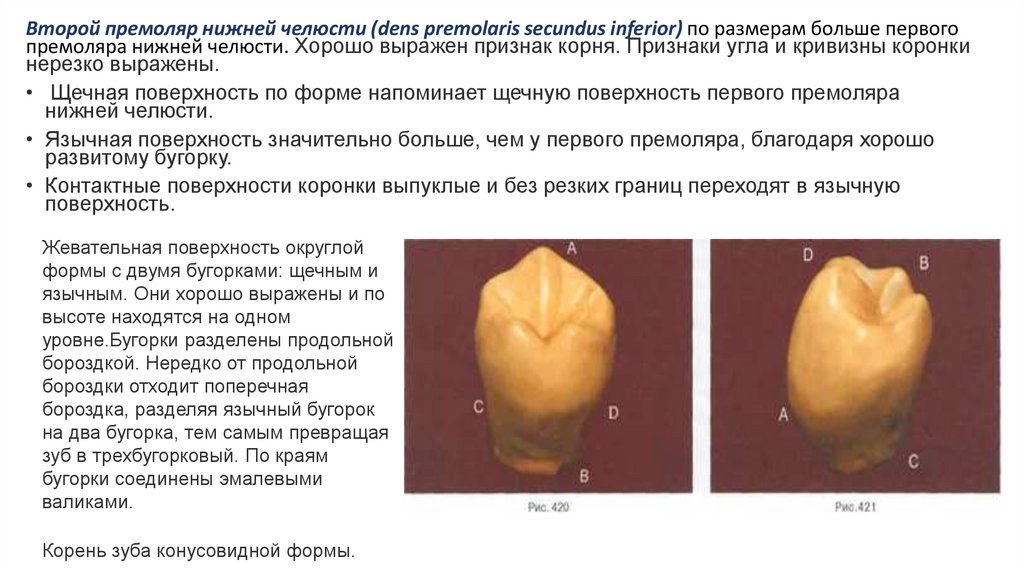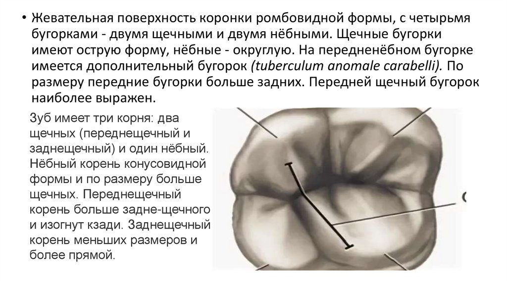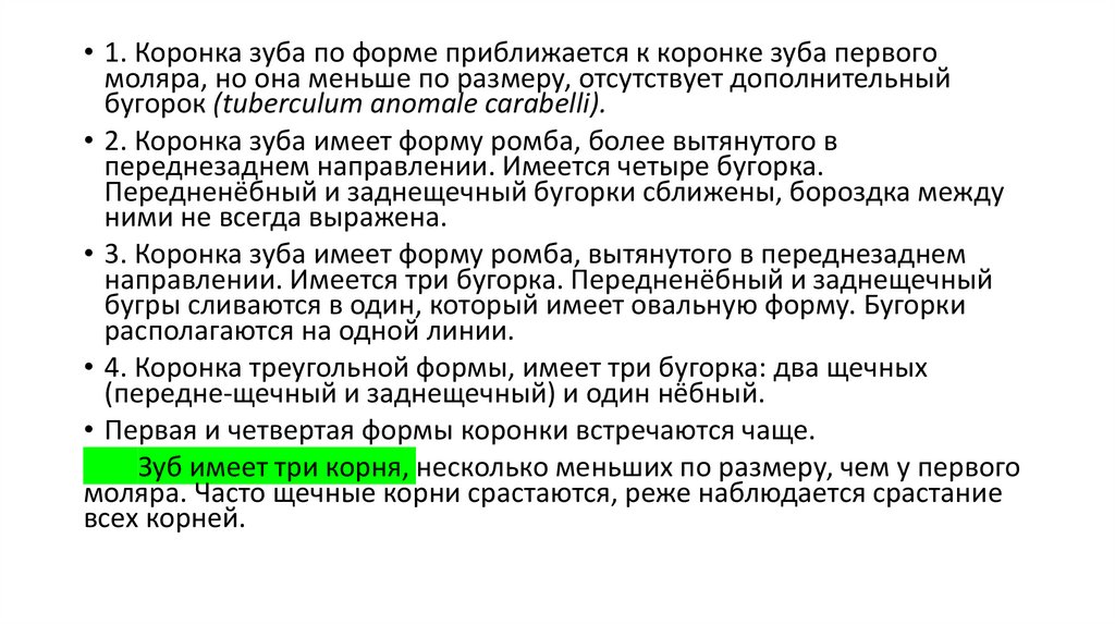 • 1. Коронка зуба по форме приближается к коронке зуба первогомоляра, но она меньше по размеру, отсутствует дополнительный