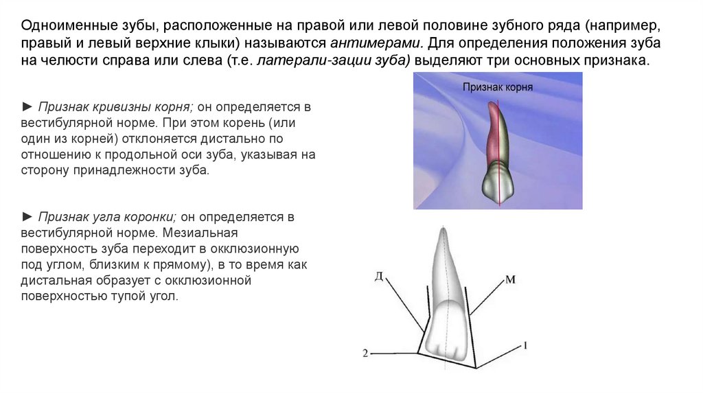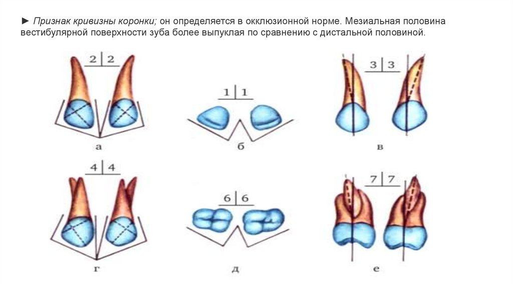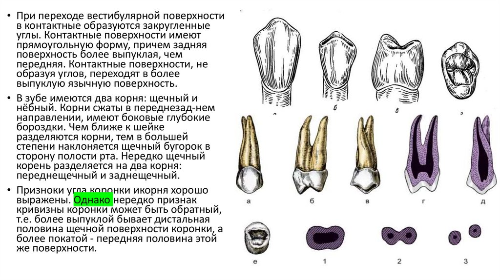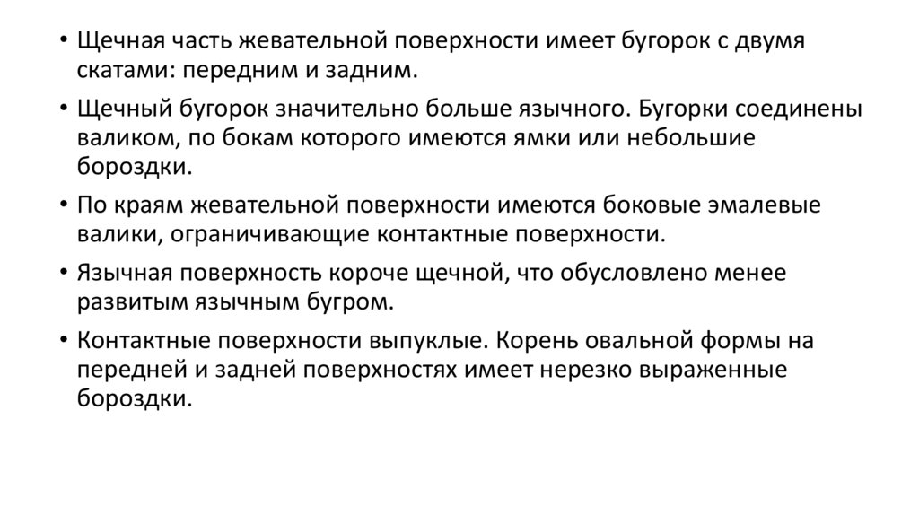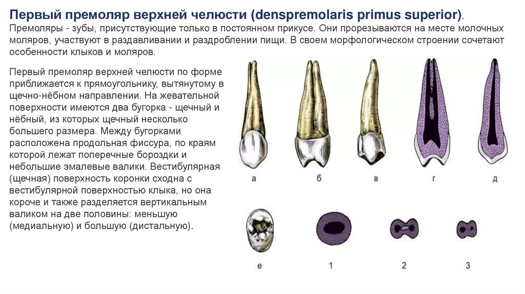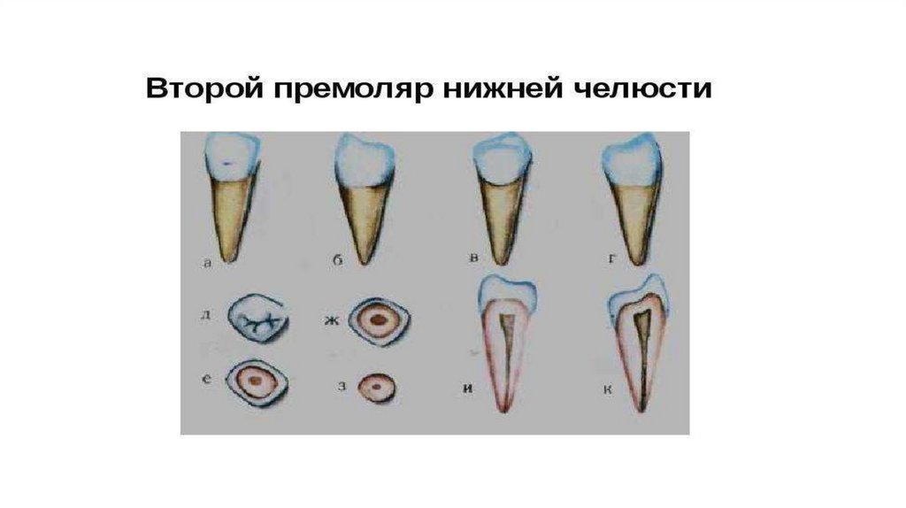 • 1. Коронка зуба по форме приближается к коронке зуба первогомоляра, но она меньше по размеру, отсутствует дополнительный