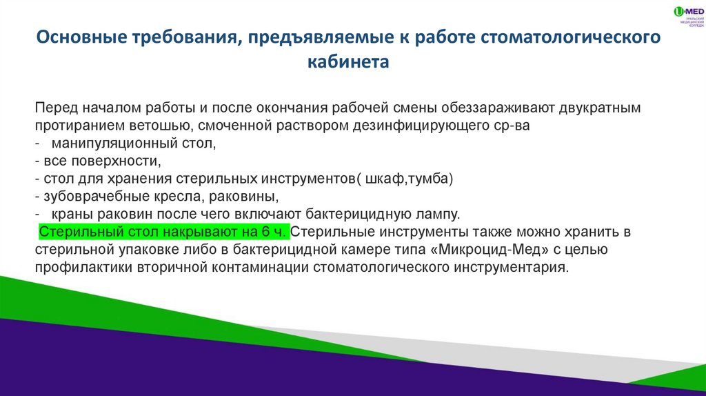 Основные требования, предъявляемые к работе стоматологическогокабинета