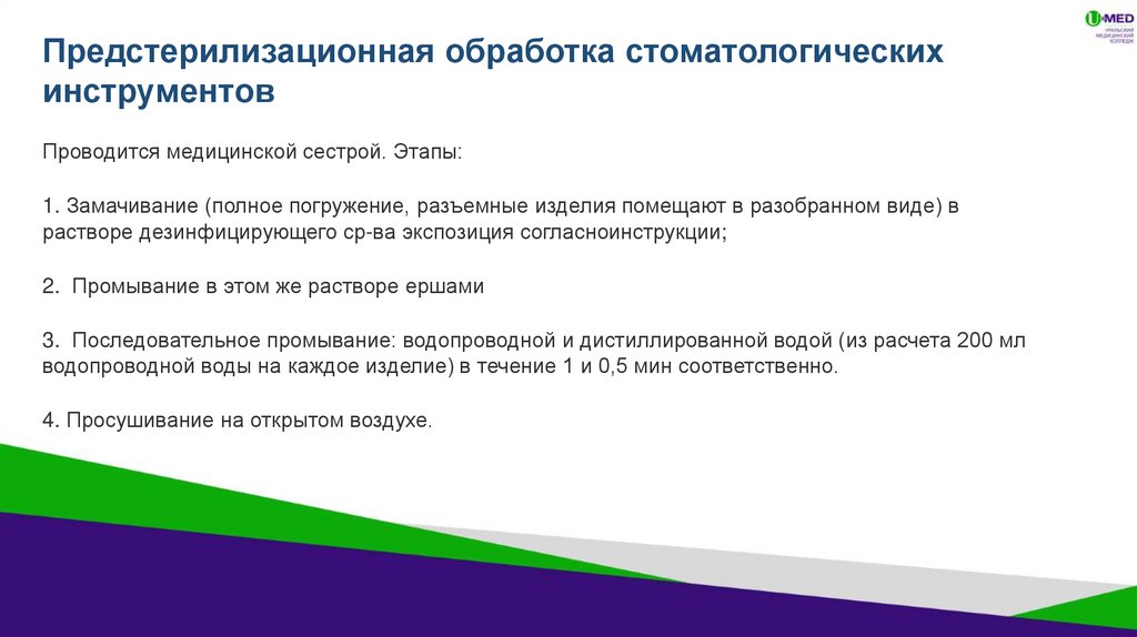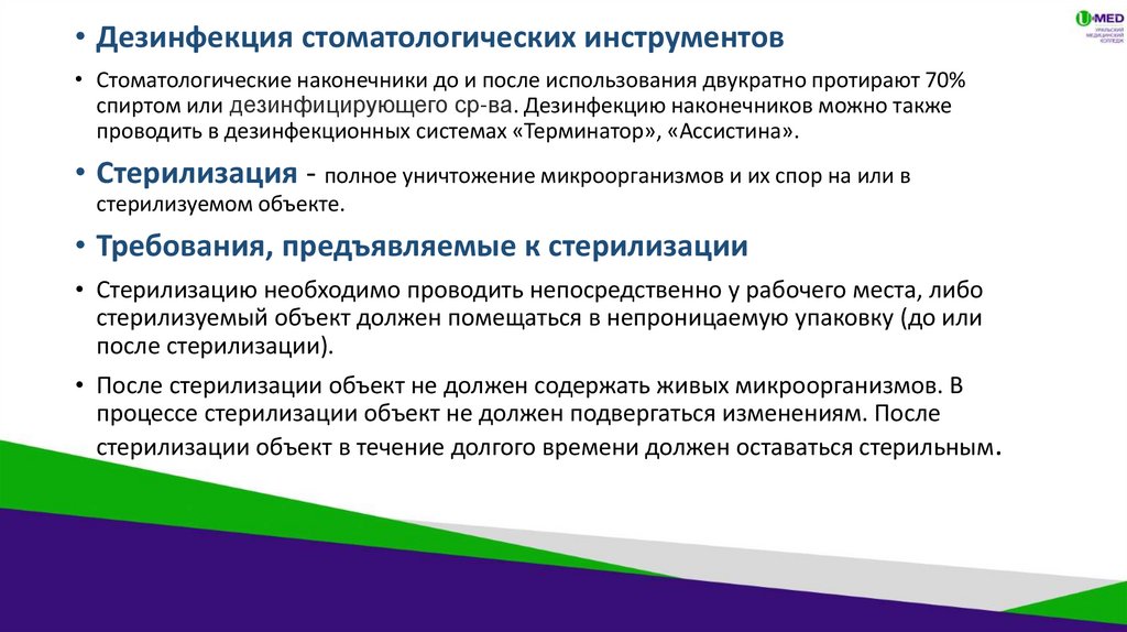 • Дезинфекция стоматологических инструментов• Стоматологические наконечники до и после использования двукратно протирают 70%