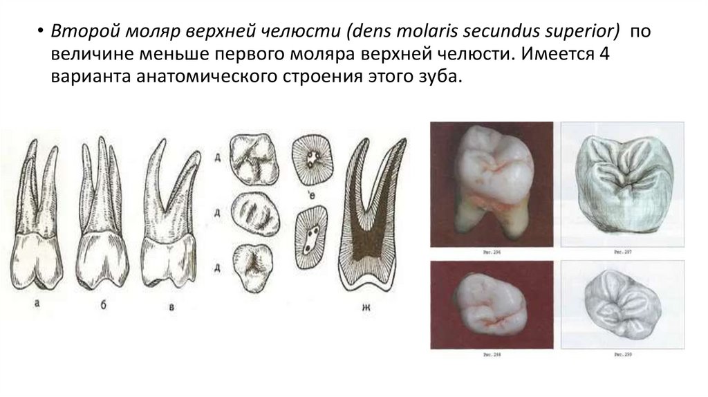 • Второй моляр верхней челюсти (dens molaris secundus superior) повеличине меньше первого моляра верхней челюсти. Имеется 4