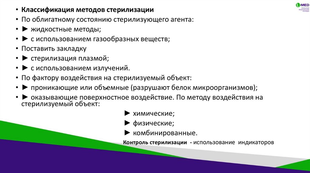 • Классификация методов стерилизации• По облигатному состоянию стерилизующего агента: