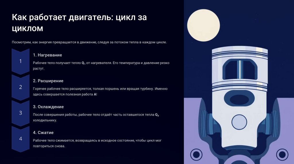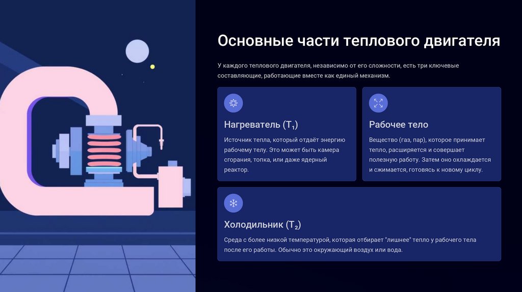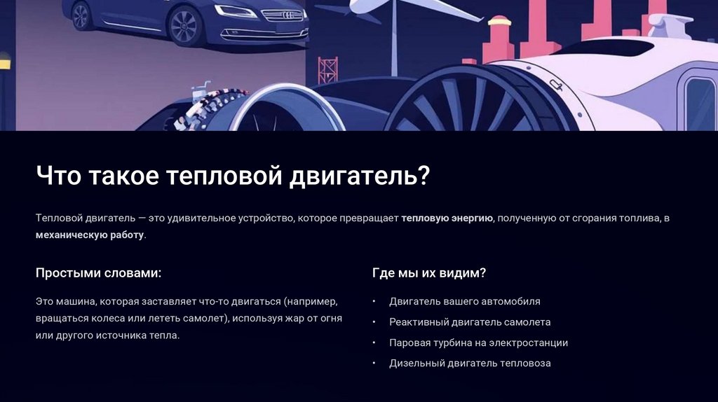Что такое тепловой двигатель?Тепловой двигатель — это удивительное устройство, которое превращает тепловую энергию, полученную от сгорания топлива, в