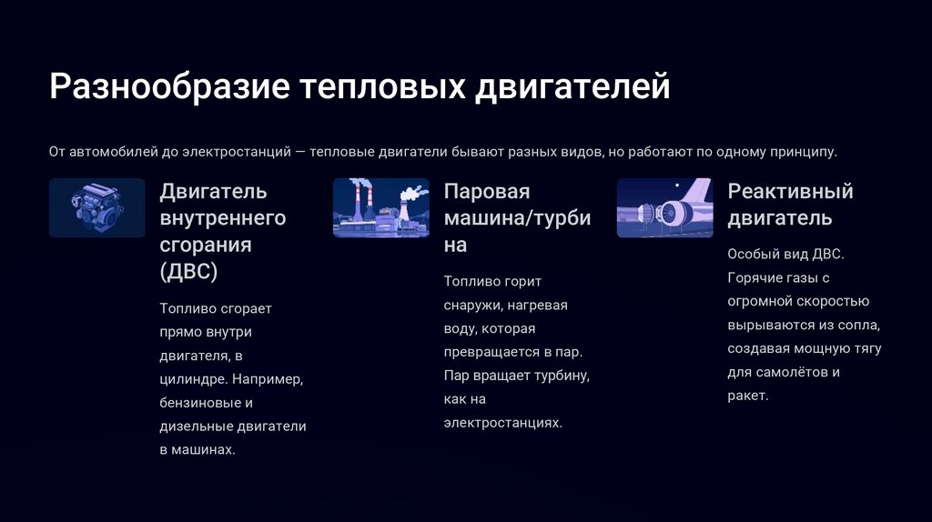 Разнообразие тепловых двигателейОт автомобилей до электростанций — тепловые двигатели бывают разных видов, но работают по одному принципу.