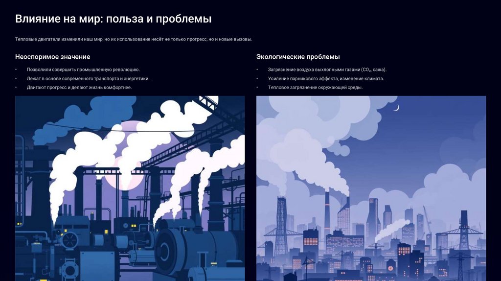 Влияние на мир: польза и проблемыТепловые двигатели изменили наш мир, но их использование несёт не только прогресс, но и новые вызовы.